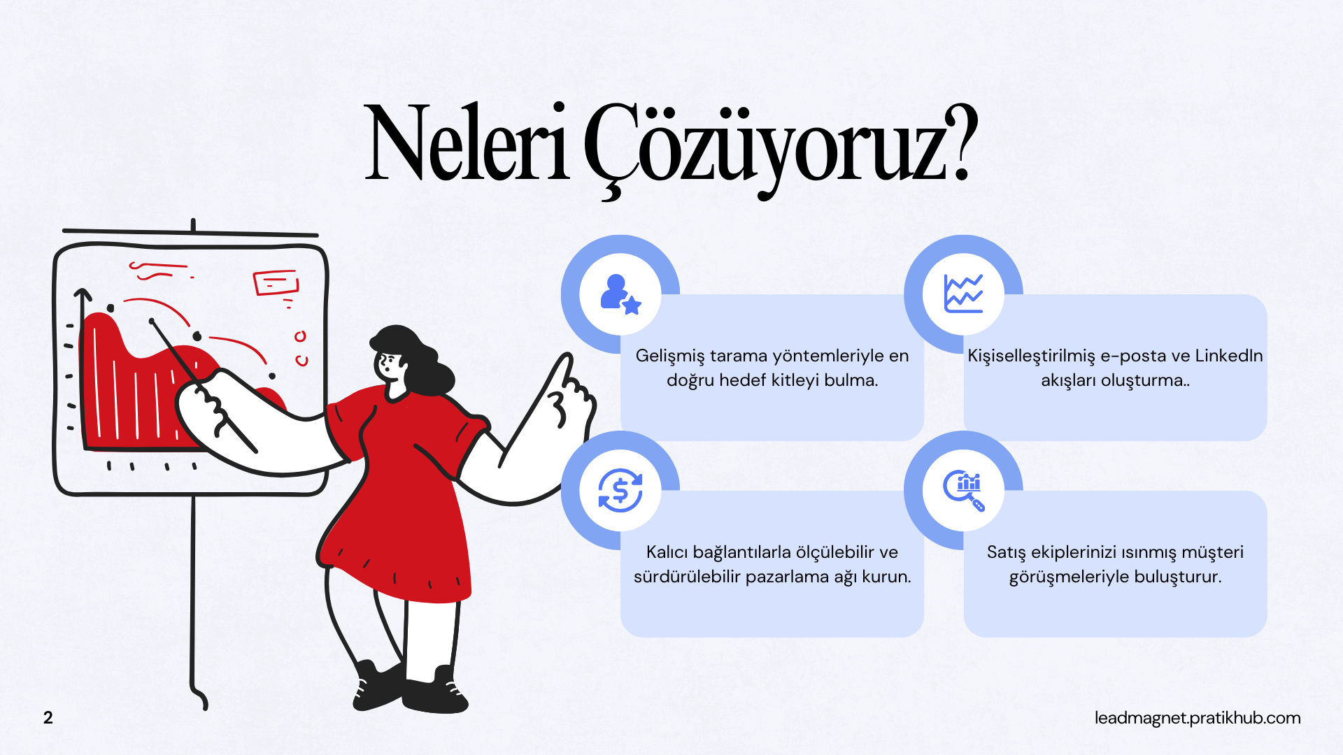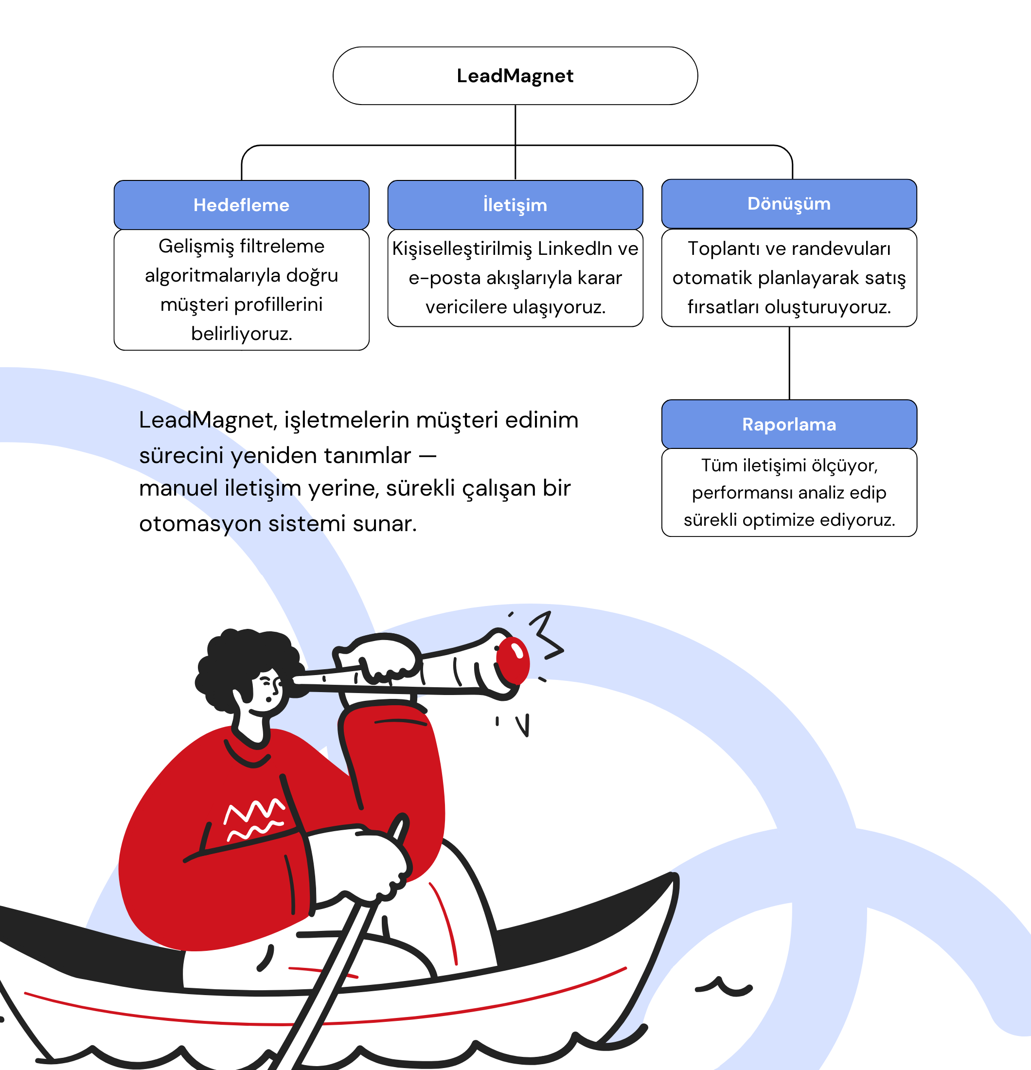 LeadMagnet, işletmeniz için yeni müşteri görüşmelerini otomatik olarak oluşturur. Akıllı hedefleme, çok kanallı iletişim ve dönüşüm odaklı raporlama ile satış ekibinizin önünü açar.